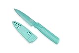 Kuhn Rikon Paring Knife in eye-popping Teal. Under all that color is a 4-inch carbon steel blade sheathed in nonstick color coating. Slices slide right off the blade, making each cut easier and neater. Matching safety sheath protects the blade when traveling or for storage.